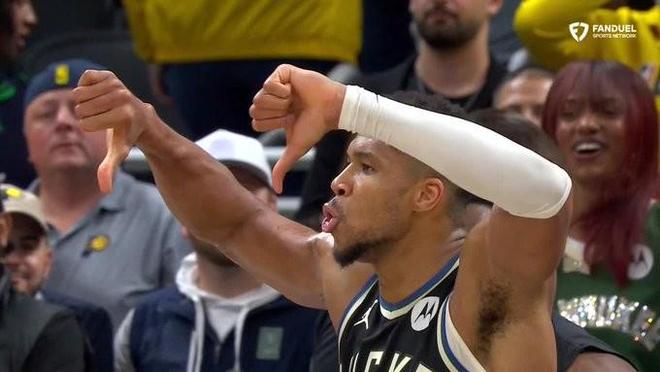 在字母哥完成這記精彩的中投絕殺后,他先是與隊友進行了慶祝,隨后他向步行者主場球迷先后做出了“噤聲”和“雙手大拇指向下的喝倒彩”動作。