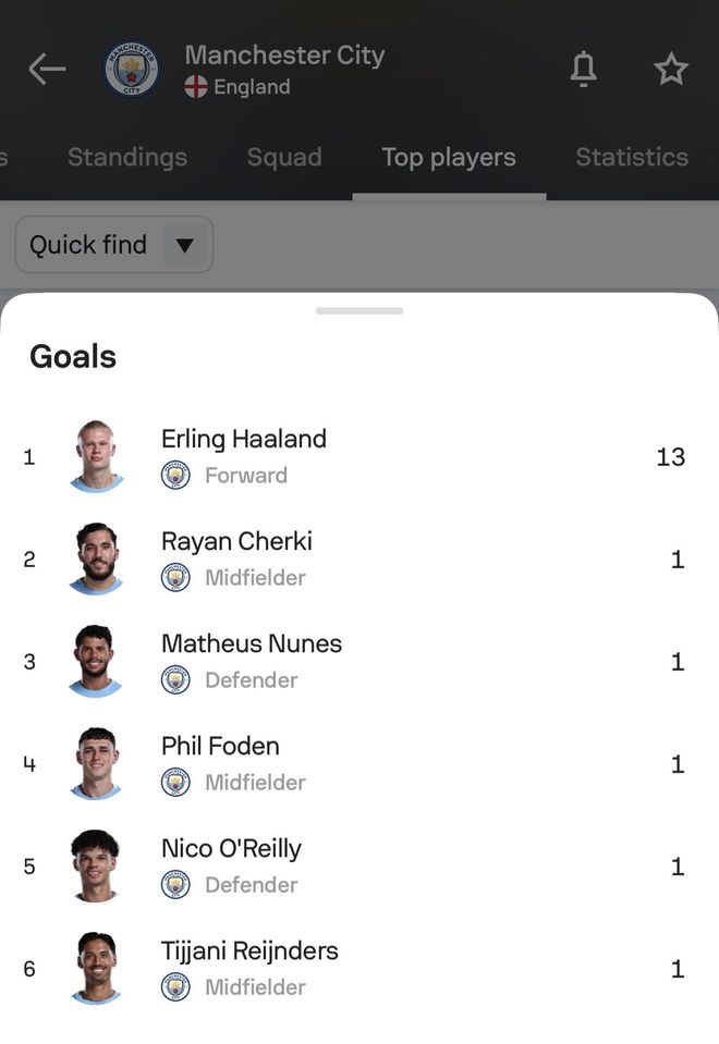 在射手榜上,哈蘭德本賽季的優勢已經達到了7個球(第二名維爾貝克6球)。而整個聯賽中,其他球員的進球數仍未能達到他的一半,而且聯盟中有一半球隊目前的總進球數都比哈蘭德的13個要少。