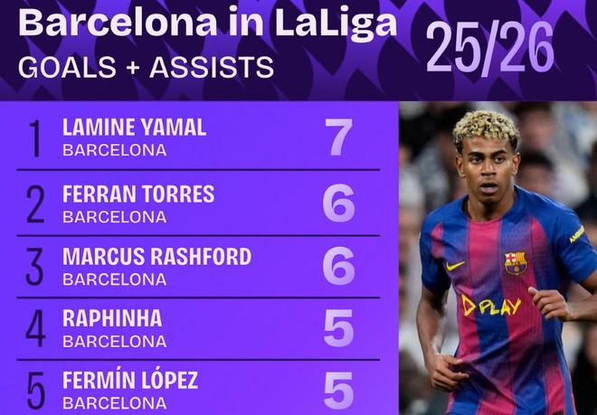 賽后根據Squawka的統計,巴薩是本賽季至今歐洲五大聯賽中唯一一支有5名球員至少參與5粒聯賽進球的球隊,目前亞馬爾為巴薩在西甲貢獻了3球4助攻、費蘭-托雷斯5球1助攻、拉什福德2球4助攻、拉菲尼亞3球2助攻,費爾明-洛佩斯3球2助攻。