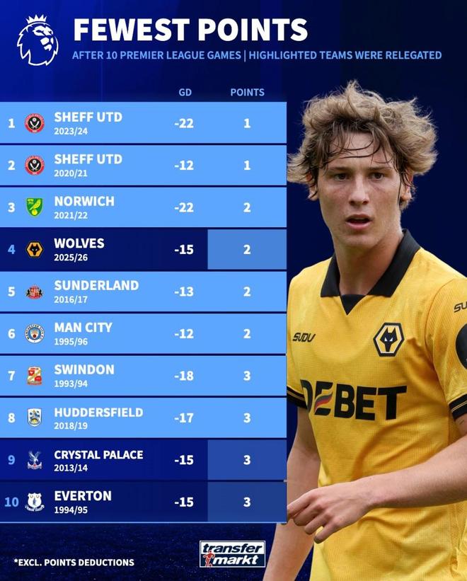 北京時間11月3日,來自德轉的統計指出,狼隊本賽季英超前10輪過后僅積2分,凈勝球-15的成績為英超歷史聯賽同期第三差的成績。在這份榜單中,除狼隊以外,排名前八的球隊當賽季都最終降級。
